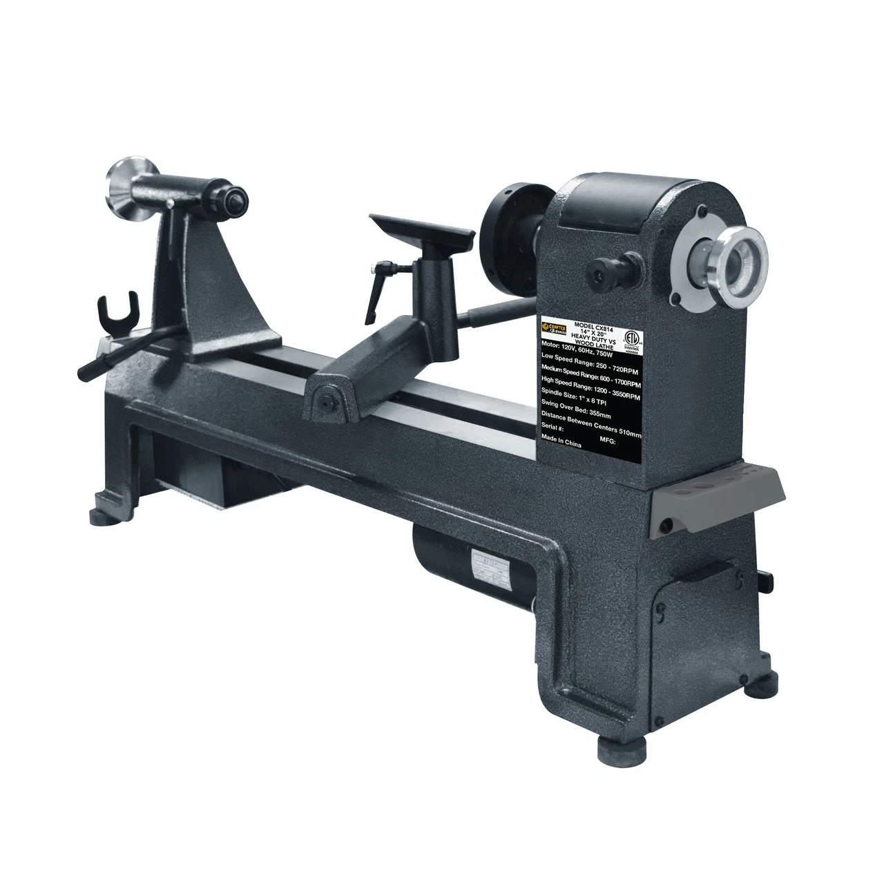 The CX814 14″ X 20″ Heavy Duty Variable Speed Wood Lathe is a small but impressive and versatile wood lathe that is equipped with a powerful 1HP Universal motor. With speed ranges from 250 up to 3550 RPM this lathe is sure to be suitable for almost any turning project with ability to dial in the exact speed required for any application. With the optional CX814EXT Lathe extension available separately you won’t have to worry about outgrowing this lathe as it can grow along with your interests in wood turning. All this is finished off with an ultra durable hammer tone finish that will help your machine look new and stand the test of time.