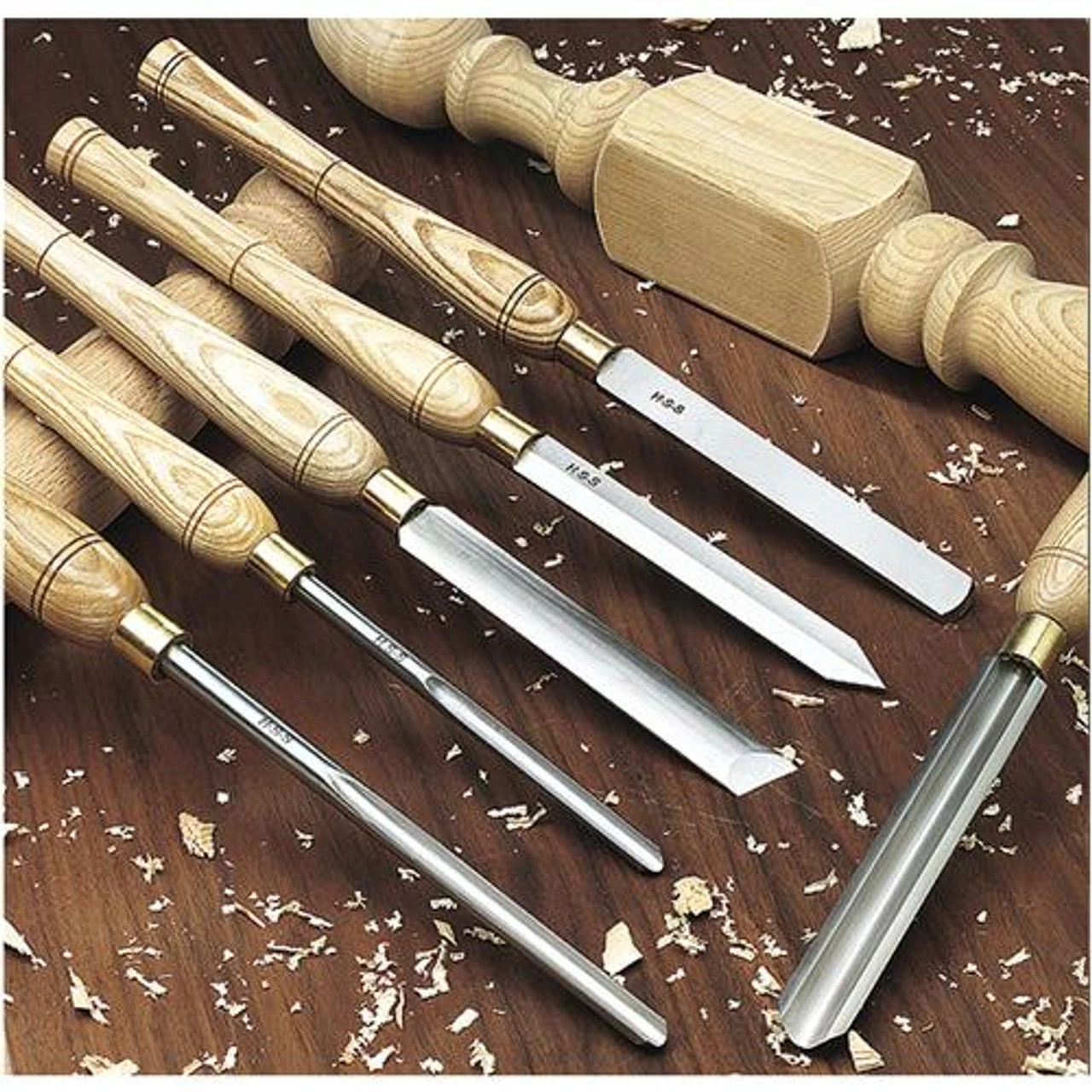 For serious wood turners, this Deluxe Lathe Chisel Set features beefy ash handles for unsurpassed control, brass ferrules and high speed steel blades. Includes: 15/16″ x 17″ Parting Tool, 13/16″ x 17″ Round Nose and 3/8″ x 19″ Long Bowl Gouge; 1″ x 17″ Skew, a 5/8″ x 22-1/2″ Roughing Gouge and a 3/8″ x 19″ Spingle Gouge.