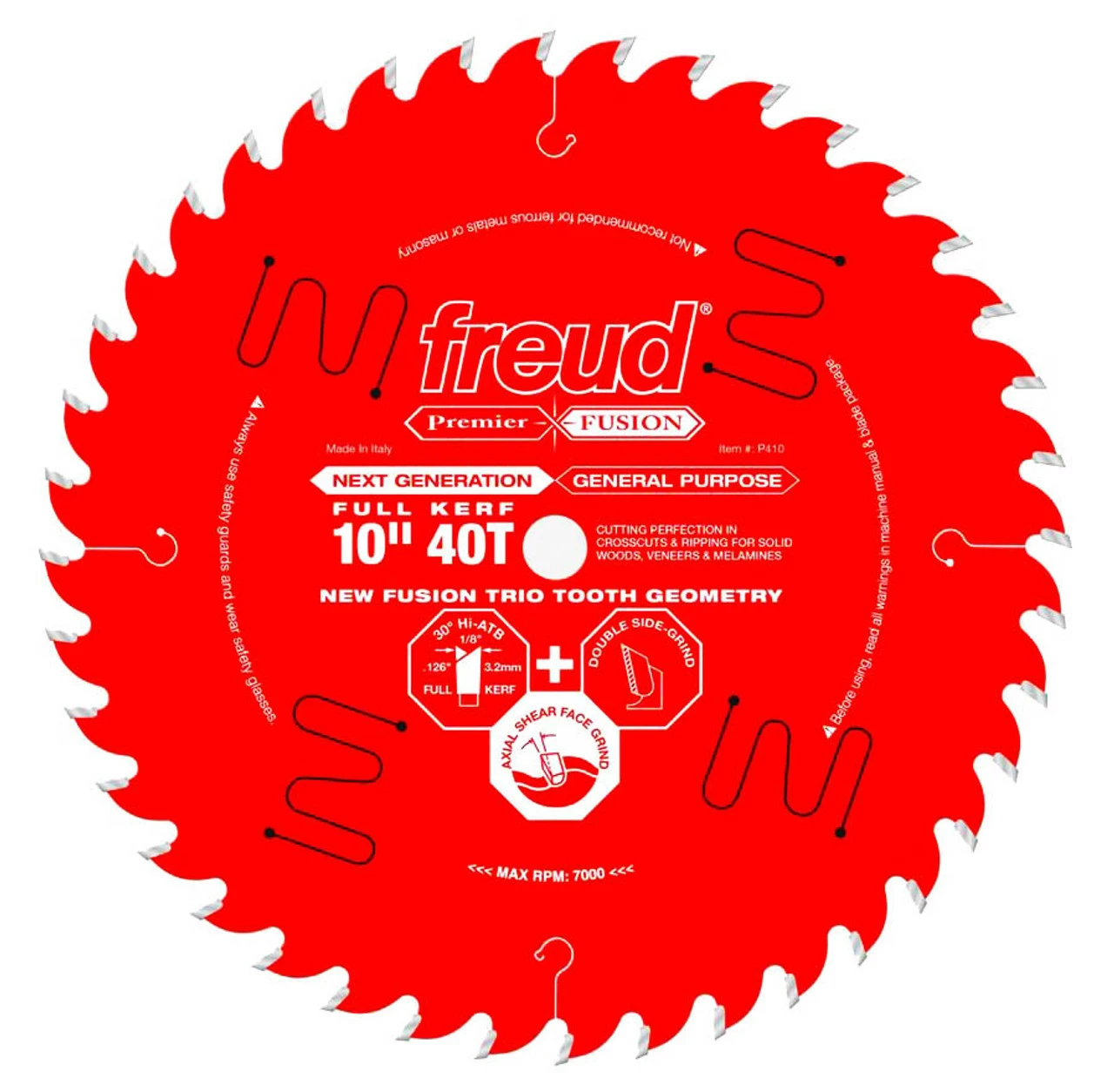 Freudβs Next Generation Premier Fusion featuring the radical new Fusion Trio Tooth Design is the most technologically advanced general-purpose blade on the market! Freud has designed these unique blades with a new radical tooth design called βFusion Trioβ which combines a special grind for the top, sides, and face of each tooth. This one-of-a-kind tooth geometry includes a 30 degree Hi-ATB, a double grind design, and an Axial Shear Face Grind to produce the ultimate polished finish in ripping and crosscutting applications with minimal resistance as it glides through in the material. Whether youβre ripping or crosscutting, the next generation Premier Fusion blade is the best for flawless cuts in laminates, melamine, veneered plywoodβs, hardwoods, softwoods, and thick stock lumber.