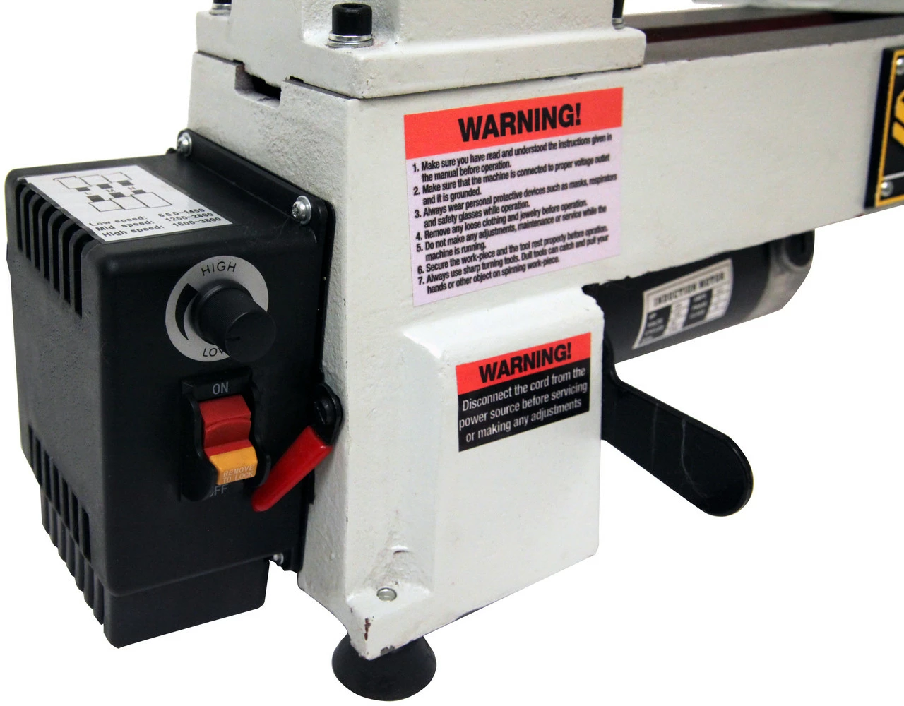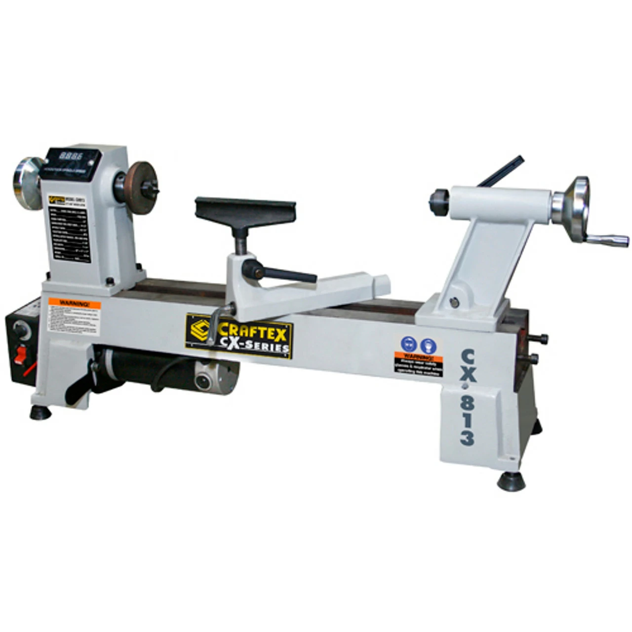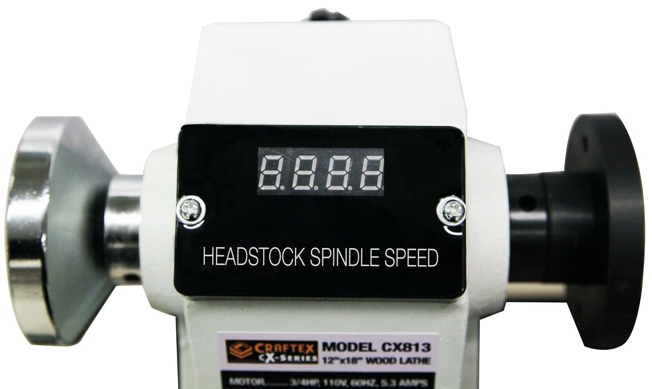 The CX813 mini wood lathe is equipped with a 3/4HP motor and turns work-piece up to 16-1/2″ in length. It comes with variable speed, ranging from 650 to 3800 RPM and features spindle digital readout which allows you to turn stock at the required speed. The On/Off switch on the lathe features a removable key which prevents from unauthorized operation.