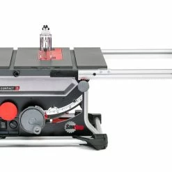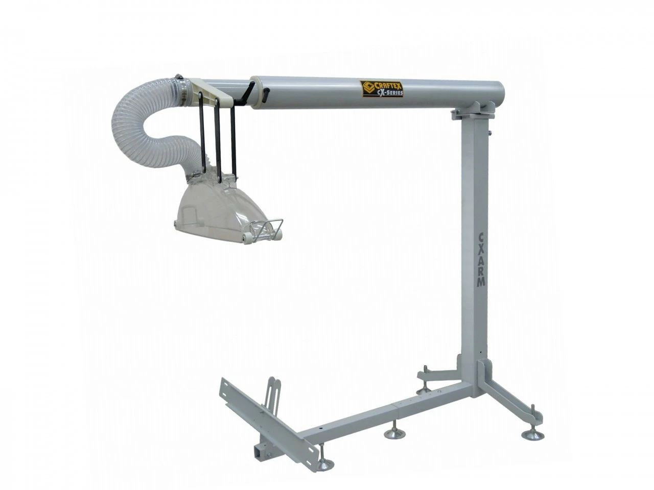 This floor standing unit will fit just about any table saw and comes with an extra support bracket that will bolt directly to your table saw base. It works easily with 4β dust collection hose and you can quickly position the over arm guard in and out thanks to the quick pivoting action.