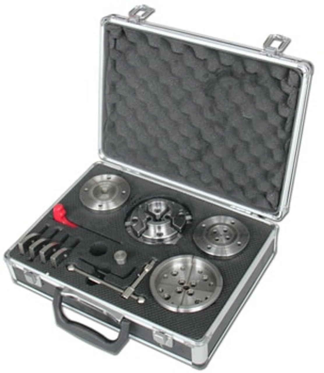 This wood lathe chuck set includes a four jaw self-centering chuck and interchangeable jaws for spindles, bowls and work-pieces that are hard to be secured.